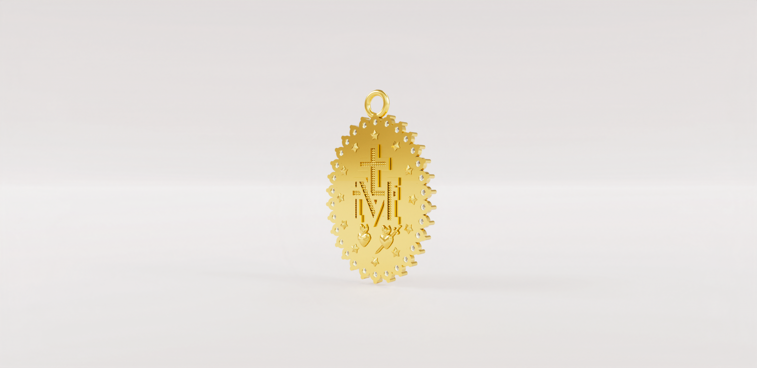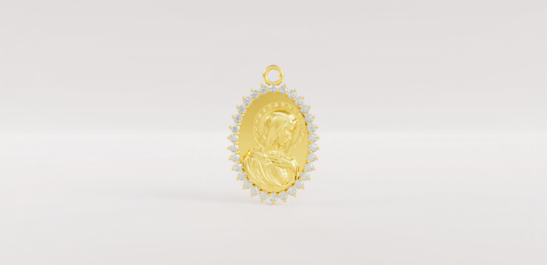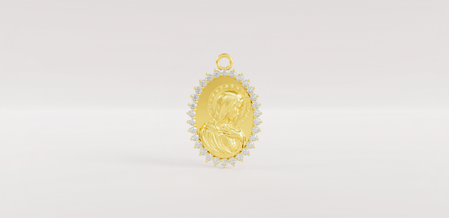 Elegant Mother Mary pendant framed with sparkling stones, offering a radiant symbol of grace and protection.