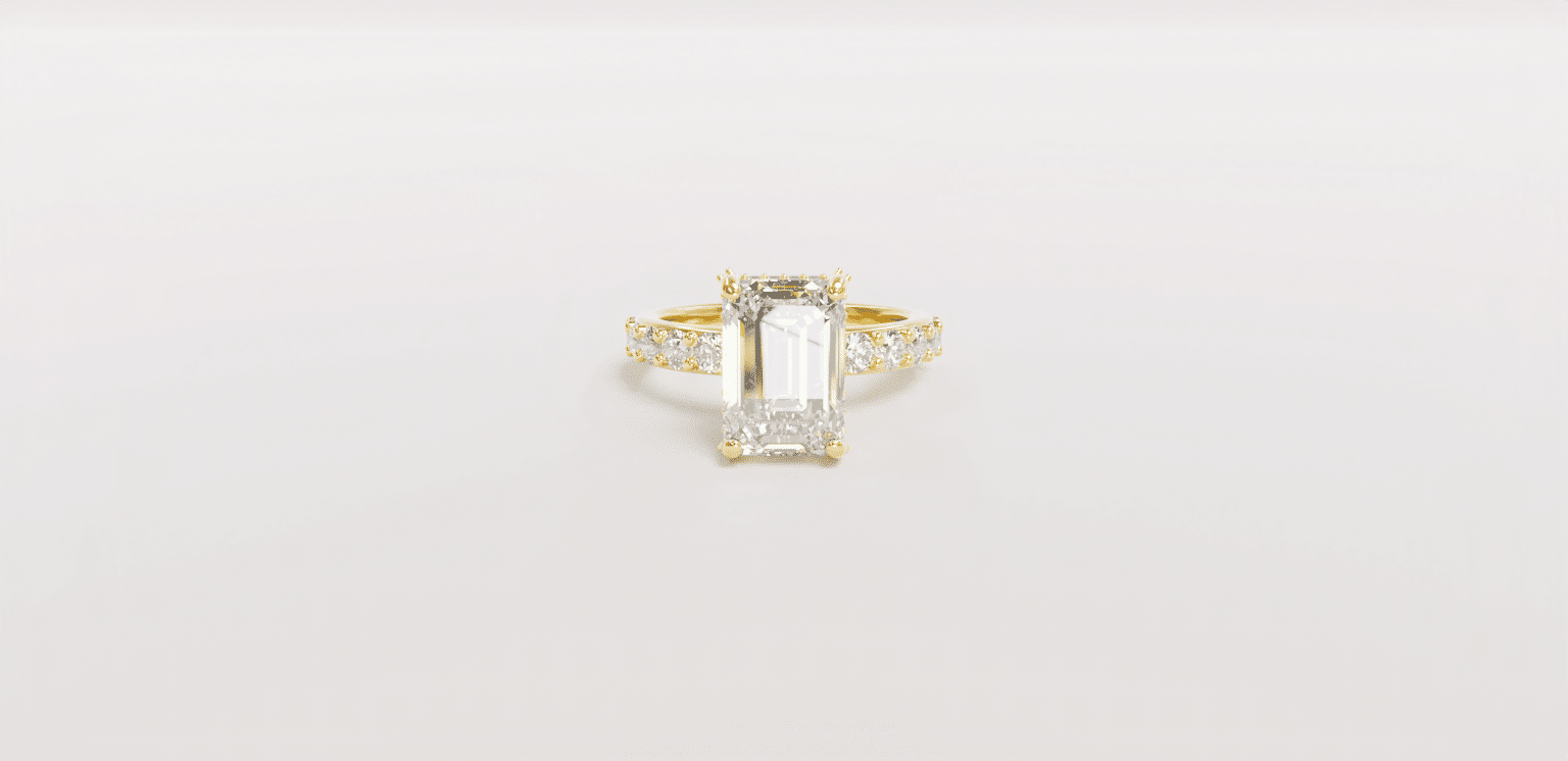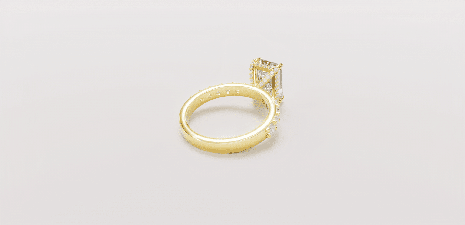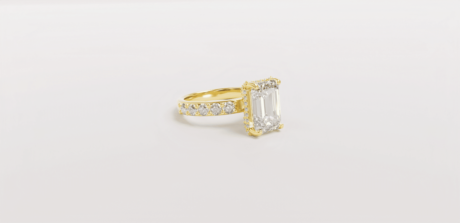 A timeless emerald-cut halo engagement ring in yellow gold, featuring a dazzling center stone and a band accented with sparkling side diamonds.