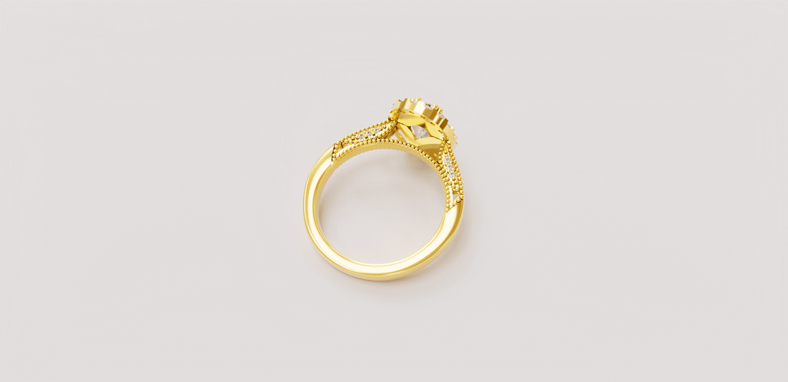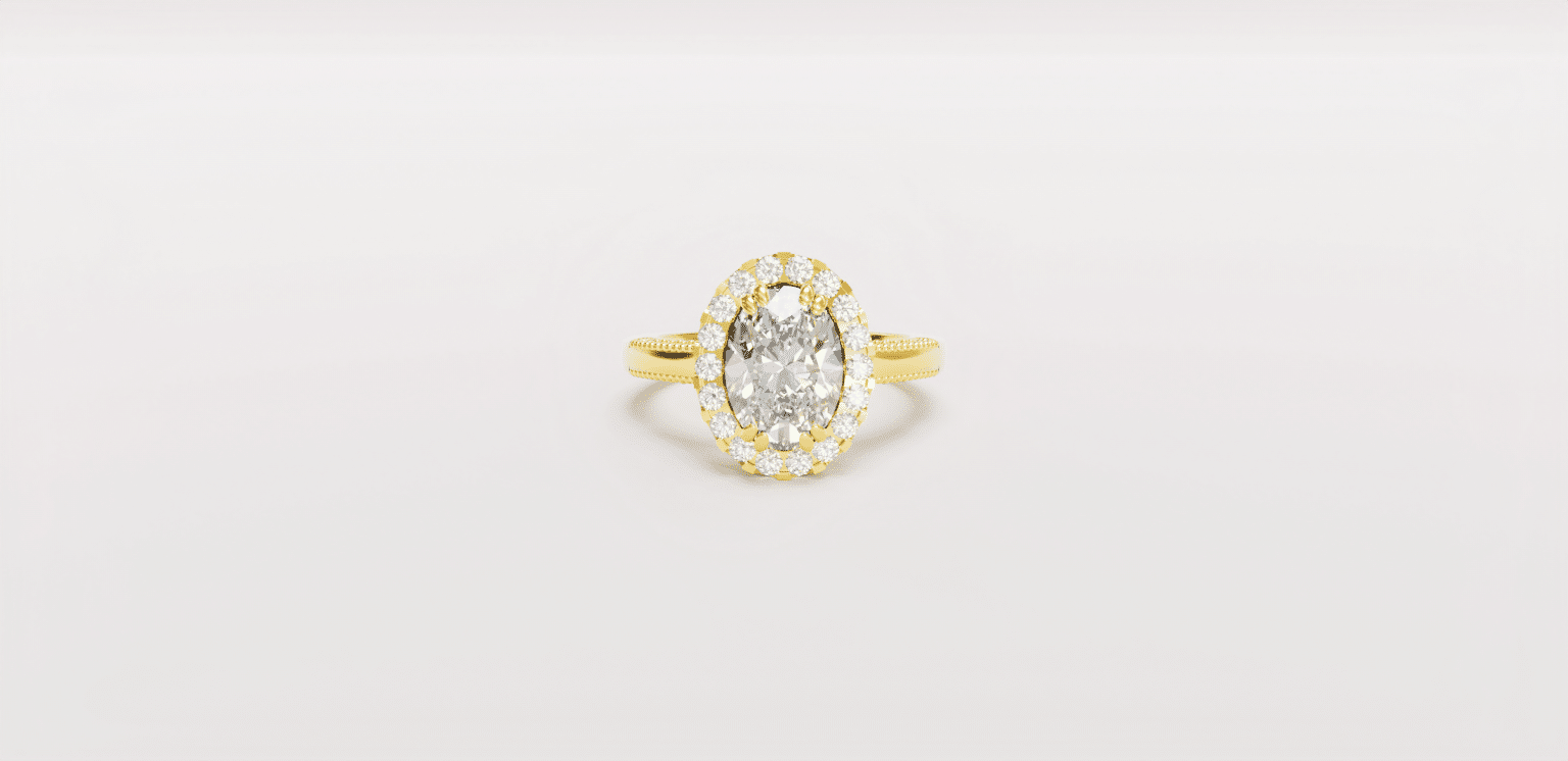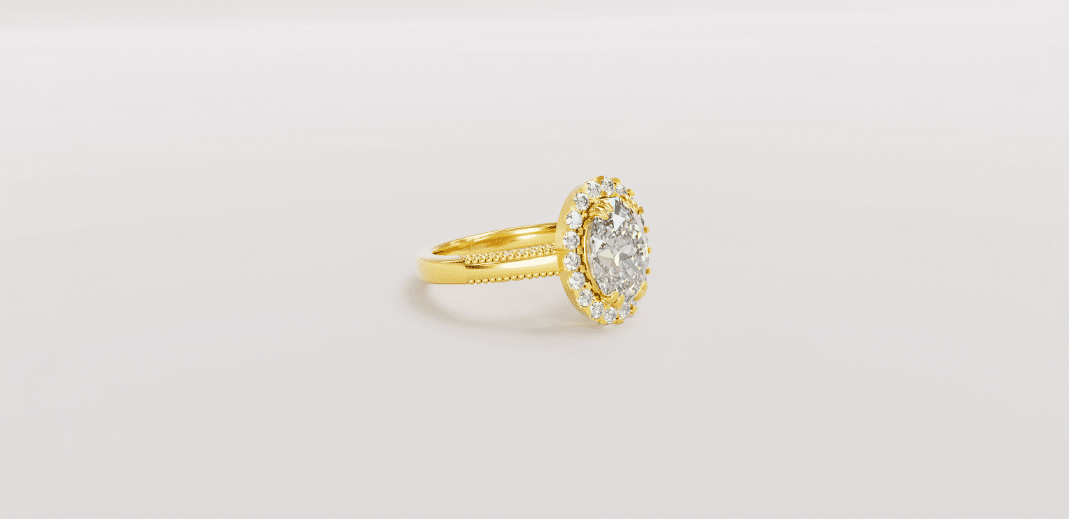 A stunning yellow gold ring featuring an oval-cut center diamond, elegantly surrounded by a halo of smaller round diamonds. The band is adorned with delicate bead detailing and sparkling side diamonds, creating a timeless vintage elegance.