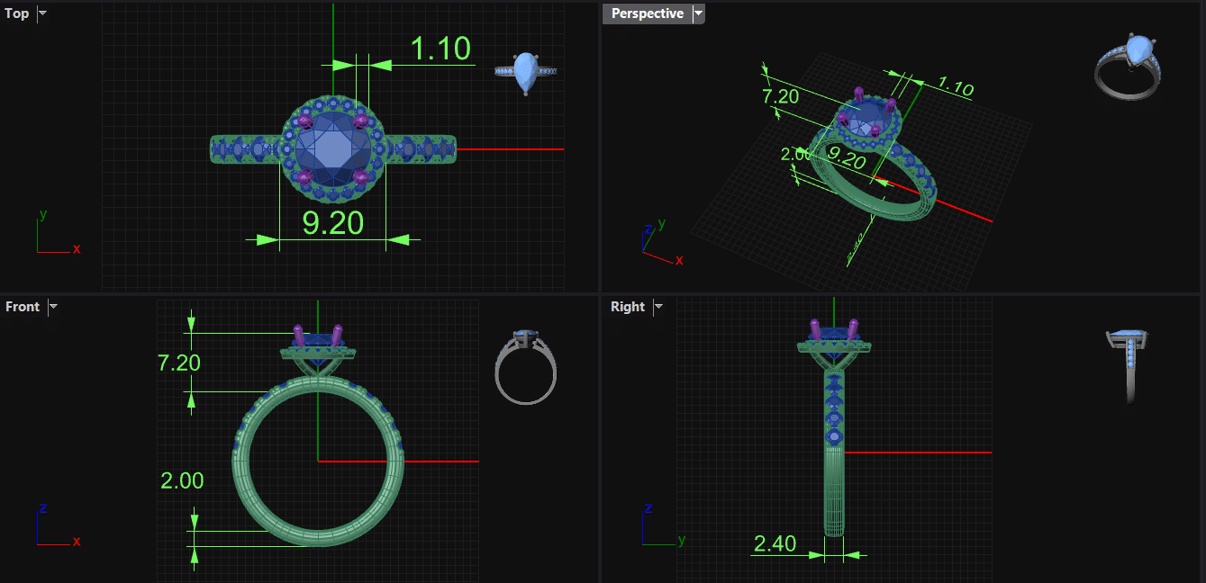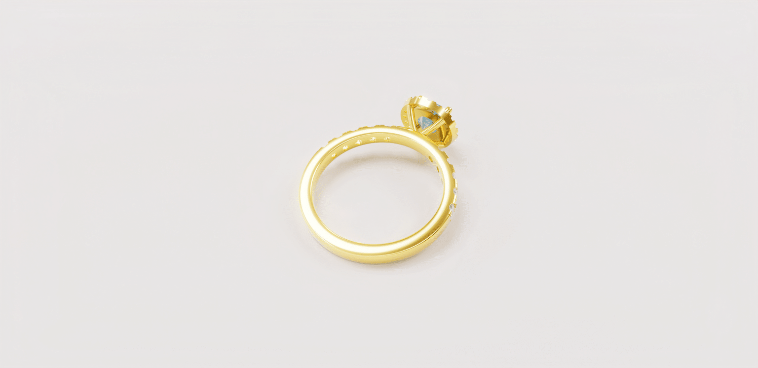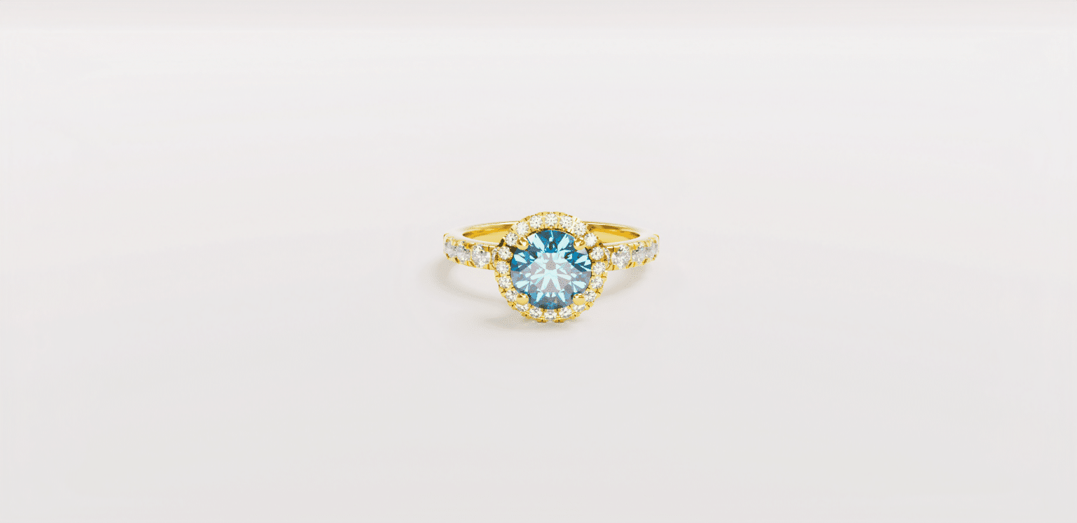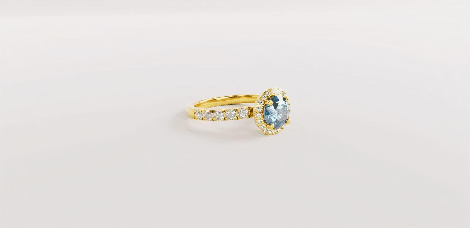 An elegant gold ring design with a blue sapphire stone, framed by shimmering white diamonds for extra brilliance.