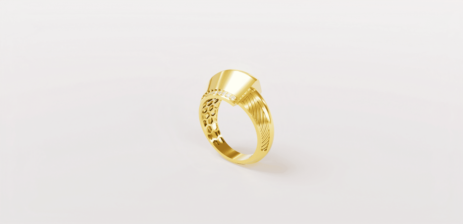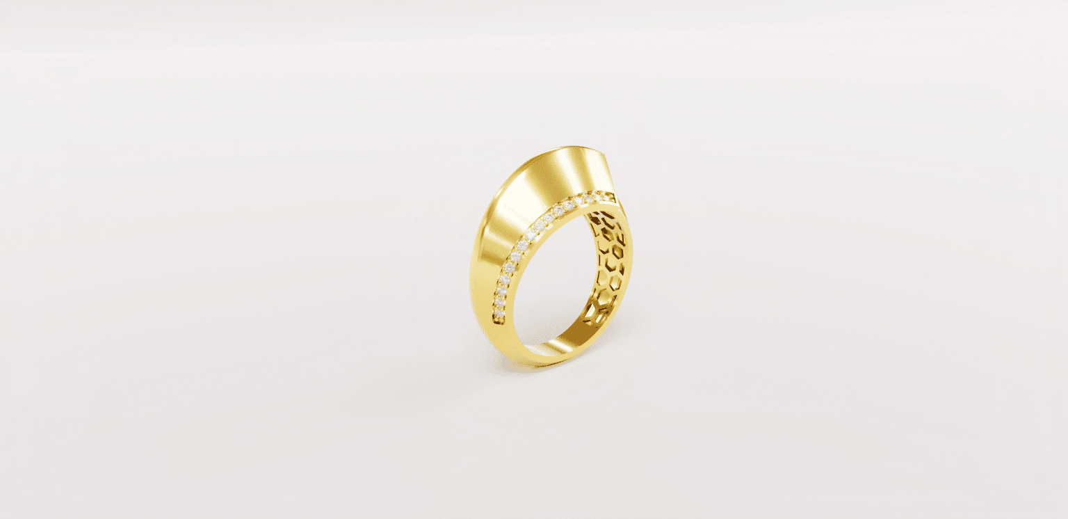 Elegant ring design featuring a modern geometric design with fine grooves and a sleek wrap-around form. Accented with a row of small sparkling stones, it blends bold structure with refined detail for a contemporary luxury look.