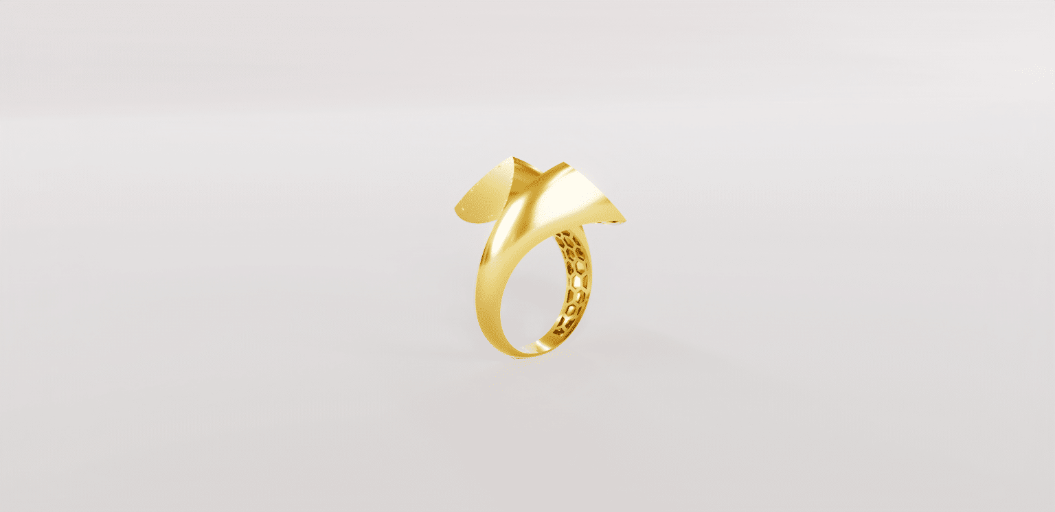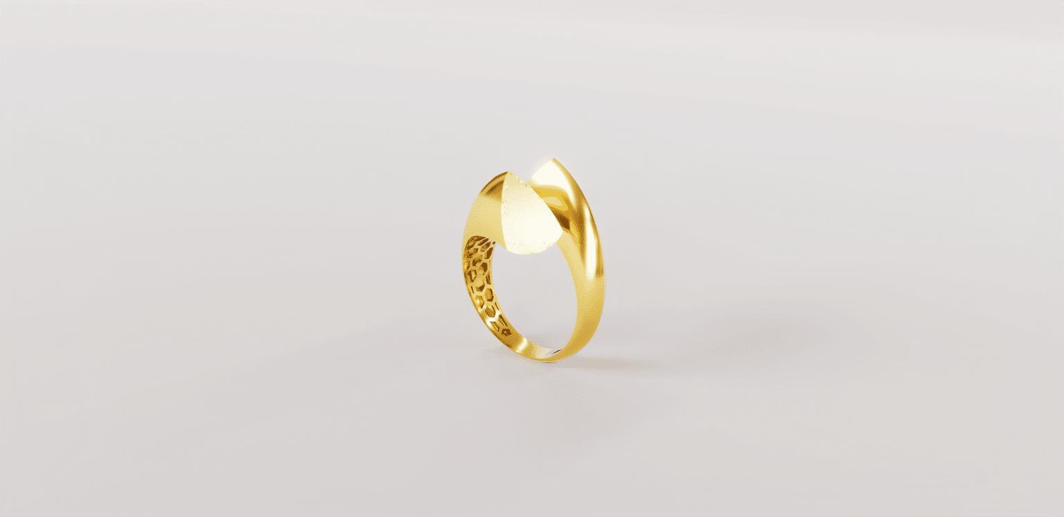 A luxurious ring design showcasing a graceful, symmetrical design with elegant curved ends that meet in perfect harmony. its smooth surface reflects timeless sophistication- a statement of refined beauty and modern elegance.