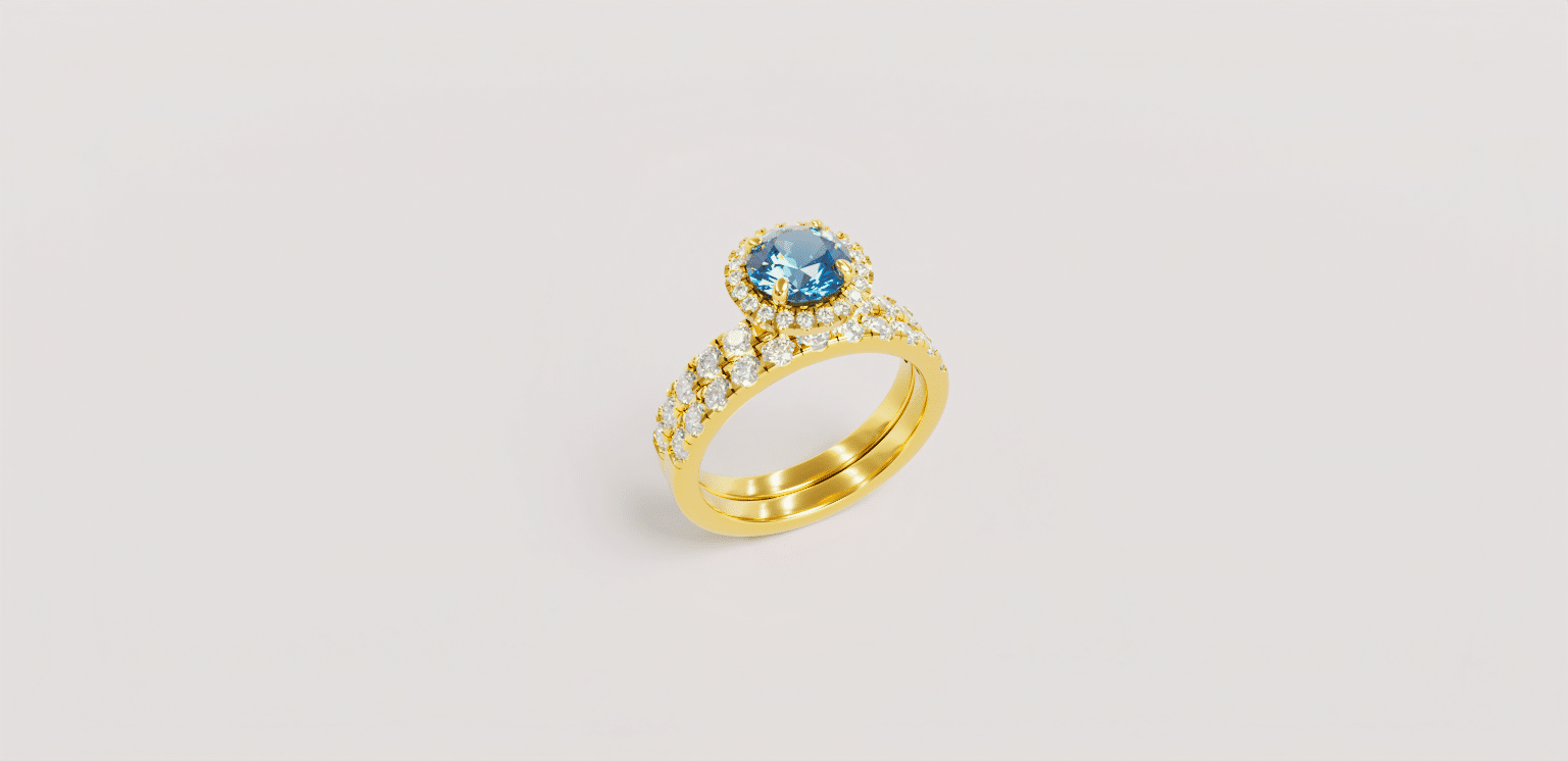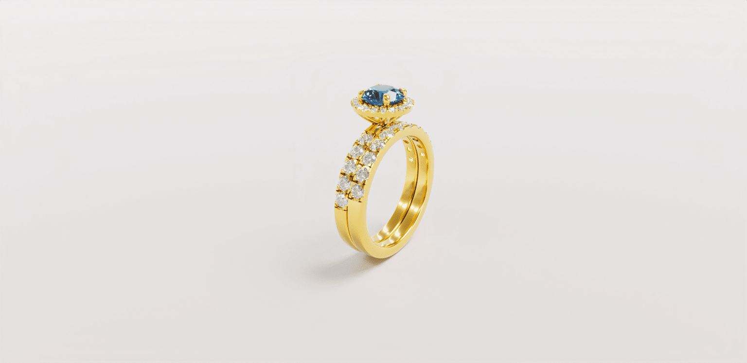 Stunning ring set featuring a brilliant center stone surrounded by a halo of diamonds and complemented by matching pavé band, a perfect blend of color, sparkle and sophistication.