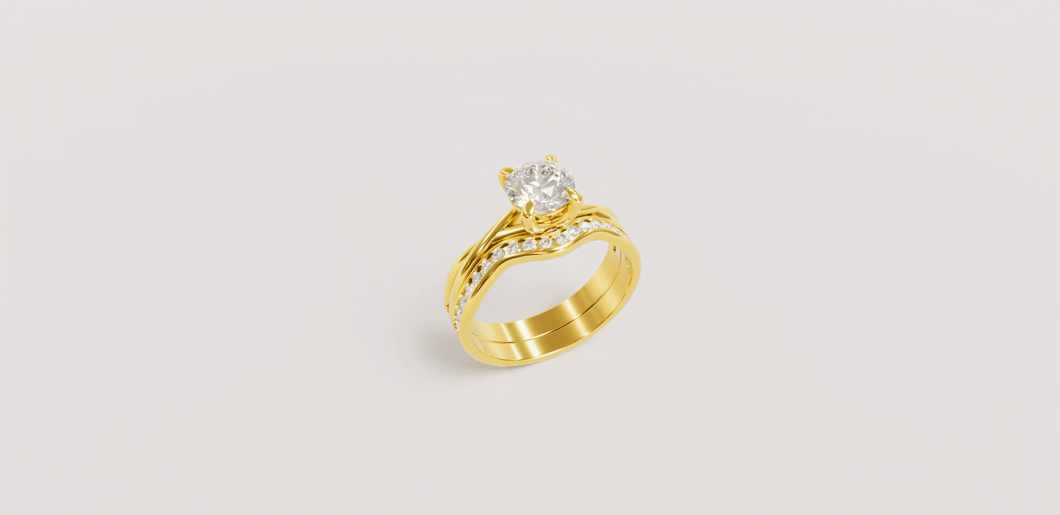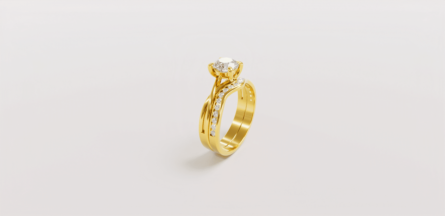 Luxurious ring set featuring a round-cut center stone on an elegant twisted band, perfectly paired with a contoured channel-set diamond band that enhances its graceful sparkle.