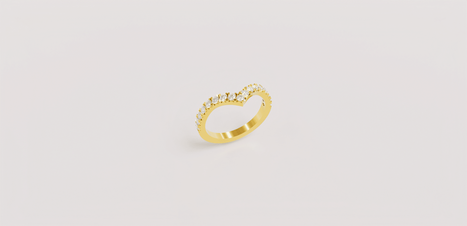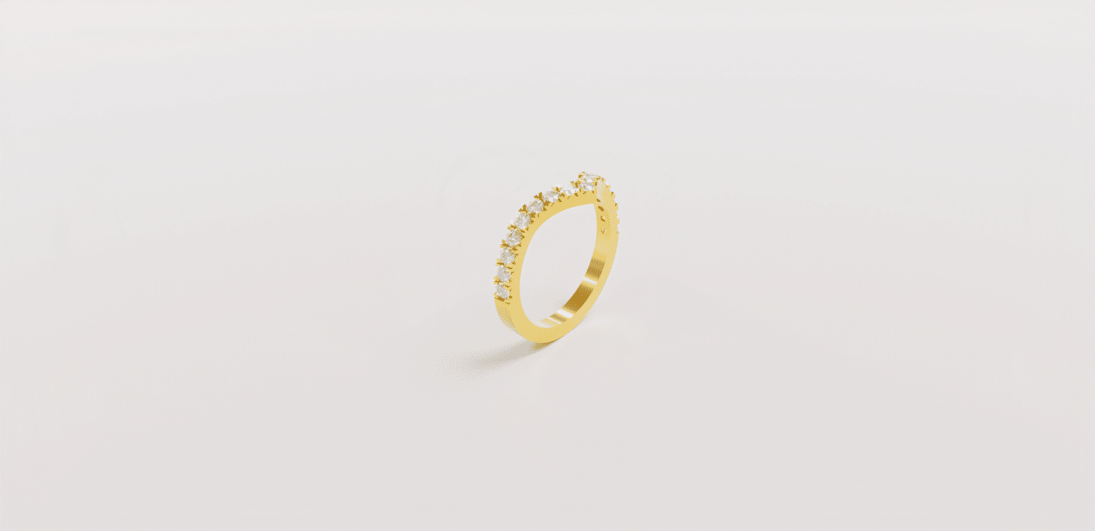 Chic eternity ring design showcasing brilliant round stones in elegant fishtail settings, creating a detailed, vintage-inspired look with a smooth contoured shape.
