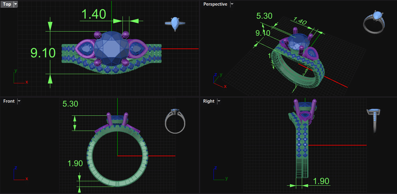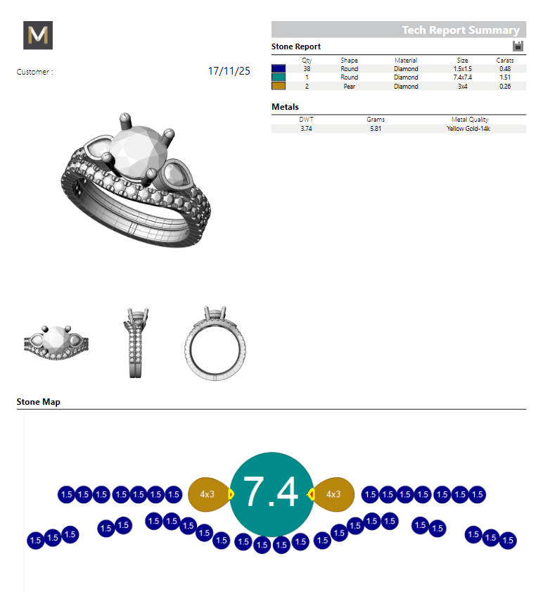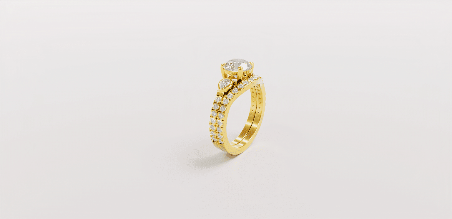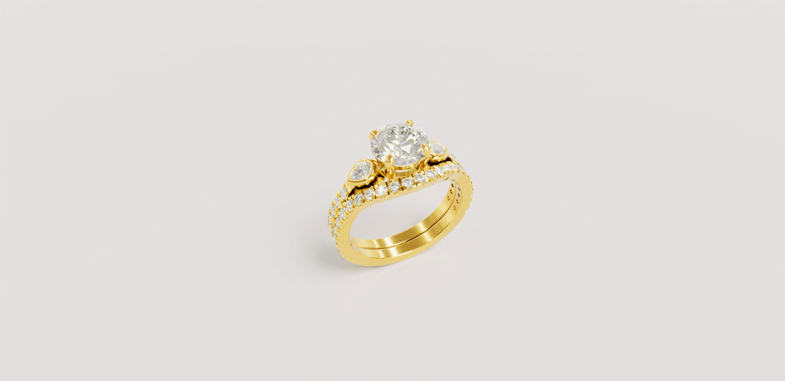 Stunning ring set featuring a round brilliant center stone accented by pear-shaped side stones, paired with a matching pavé band for a luxurious and beautifully coordinated look.