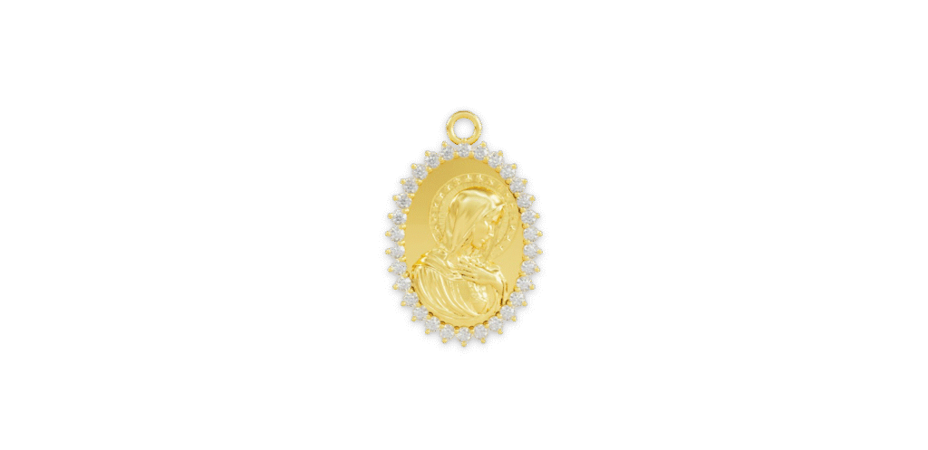 Elegant Mother Mary pendant framed with sparkling stones, offering a radiant symbol …