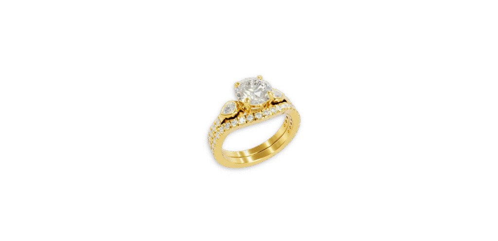 Elegant ring set featuring a pear-cut solitaire centerpiece paired with a sleek …
